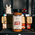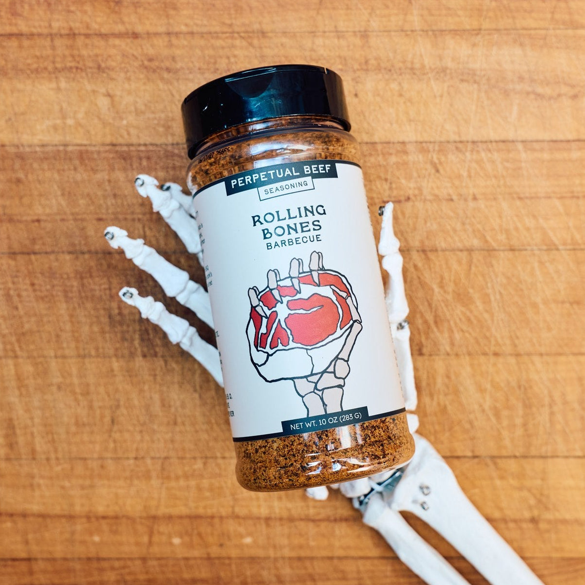 A plastic jar of Rolling Bones Barbecue Perpetual Beef dry rub with a label that features a hand holding a steak, with a background suggestive of an outdoor grilling setting.